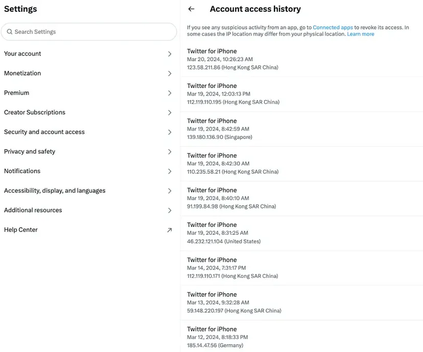 As shown below, entering Account access history allows you to view the device model, login date, IP, and region. If abnormal login information is found, the account may have been compromised.