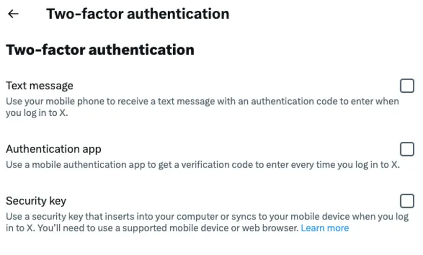 You can set up the following 2FA methods to enhance account security, such as SMS verification codes, authentication apps, and security keys.